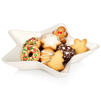 Krótki opis: Elegant porcelain star-shaped platter with a gold finish. Perfect for serving sweets, fruits, and holiday dishes.